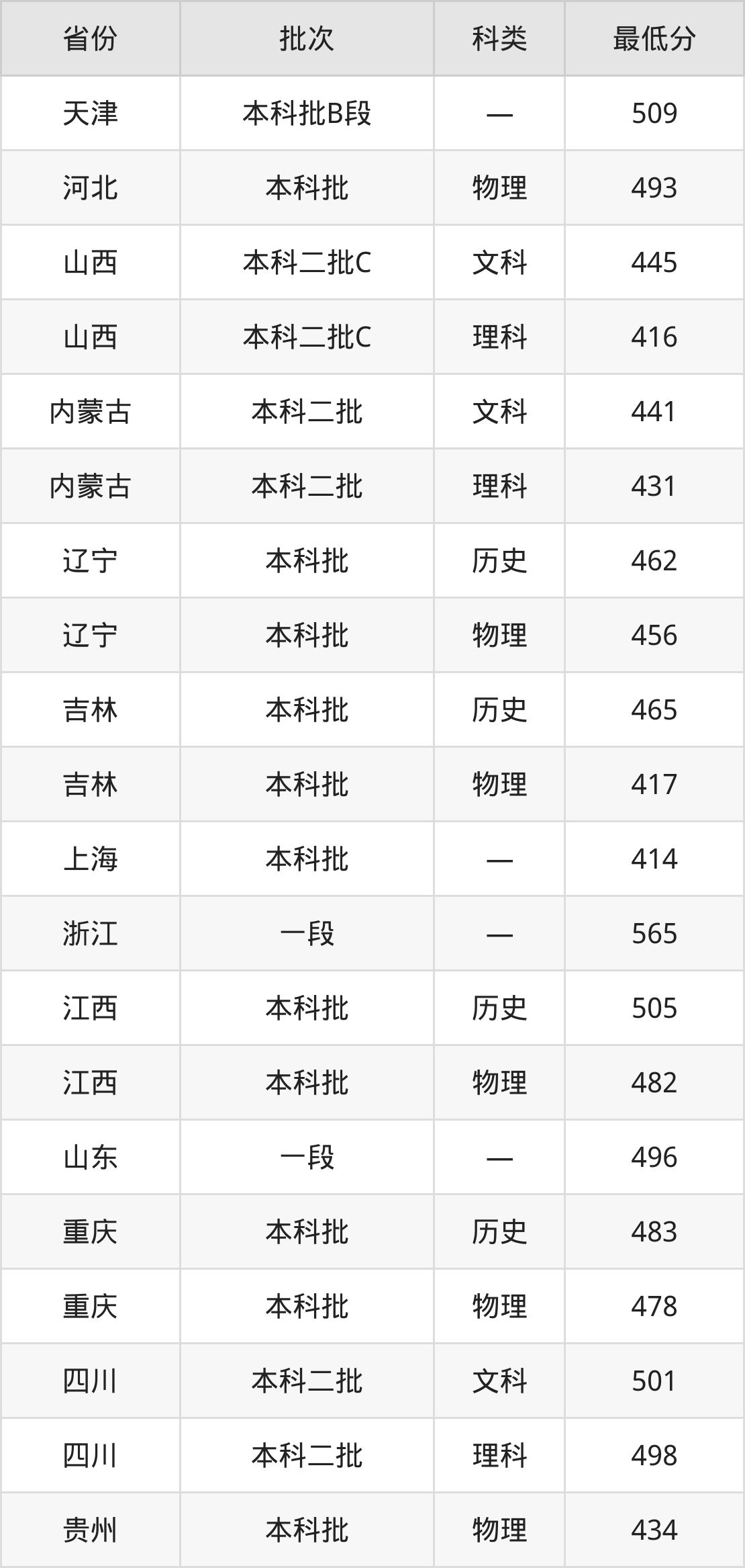 厦门大学嘉庚学院国际经济与贸易专业在全国各省最低录取分数线为341分(青海理科),除此之外,在其余地区的最低分为天津509分、吉林物理类417分、江西物理类482分、山东496分等,以上数据均为2024年数据,供2025年高考生参考。