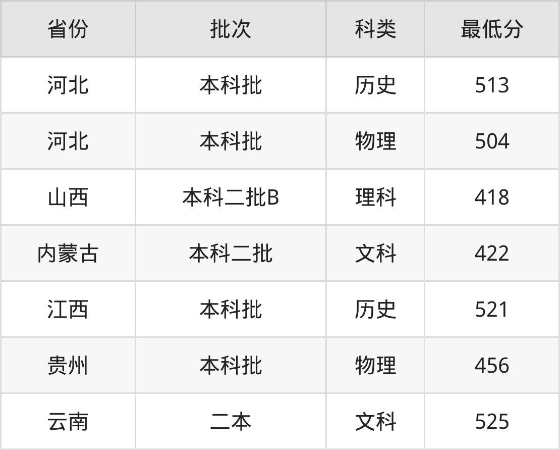湖南女子学院社会工作专业在全国各省最低录取分数线为418分(山西理科),除此之外,在其余地区的最低分为江西历史类521分、贵州物理类456分、云南文科525分、河北物理类504分等,以上数据均为2024年数据,供2025年高考生参考。