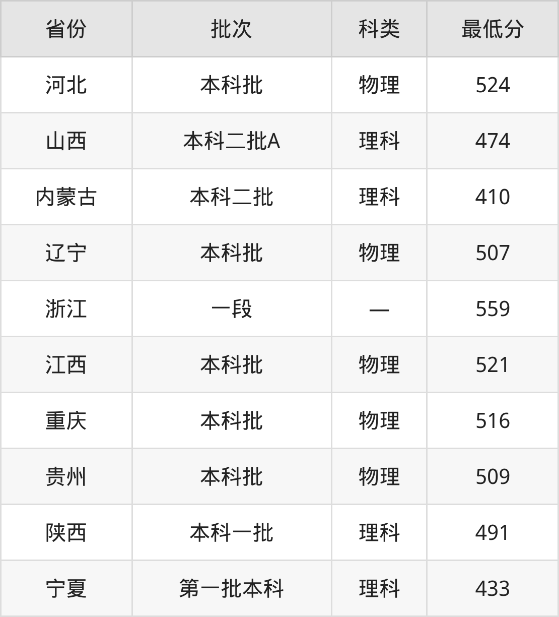 东华理工大学工程管理专业在全国各省最低录取分数线为410分(内蒙古理科),除此之外,在其余地区的最低分为重庆物理类516分、宁夏理科433分、河北物理类524分、山西理科474分等,以上数据均为2024年数据,供2025年高考生参考。