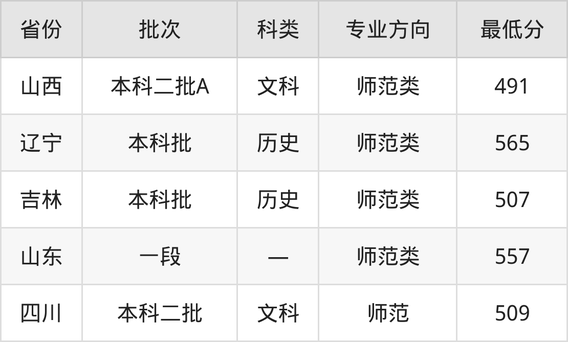 哈尔滨师范大学小学教育专业录取分数线从491分到565分不等,最低分数线如下: