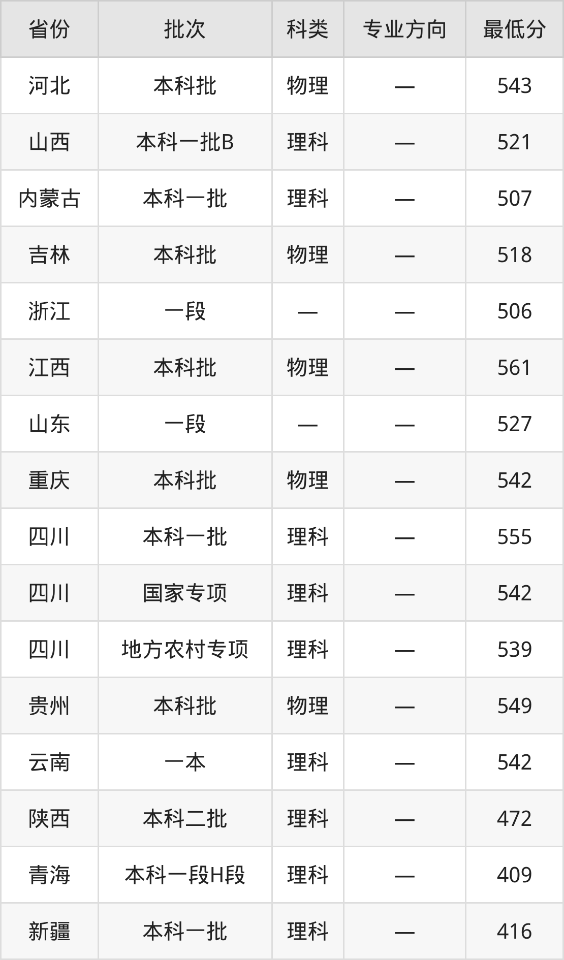 西南科技大学材料类专业录取分数线从409分到561分不等,在部分地区的最低分数线如下: