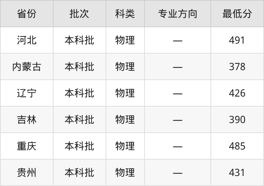 沈阳工学院兵器类专业在全国各省最低录取分数线为378分(内蒙古物理类),除此之外,在其余地区的最低分为河北物理类491分、辽宁物理类426分、吉林物理类390分、重庆物理类485分等,以上数据均为2025年数据,供2026年高考生参考。