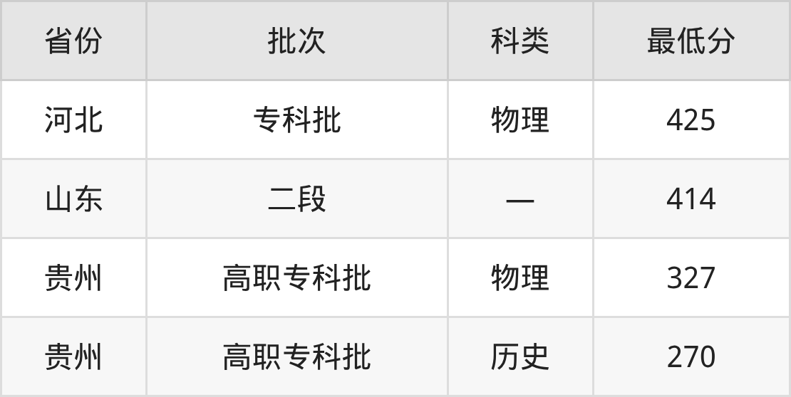 六安职业技术学院软件技术专业录取分数线从270分到425分不等,最低分数线如下:
