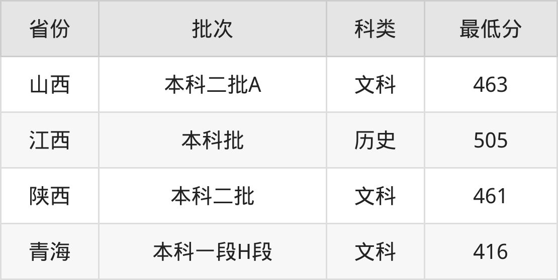 山西传媒学院非物质文化遗产保护专业在全国各省最低录取分数线为416分(青海文科),除此之外,在其余地区的最低分为山西文科463分、江西历史类505分、陕西文科461分,以上数据均为2024年数据,供2025年高考生参考。
