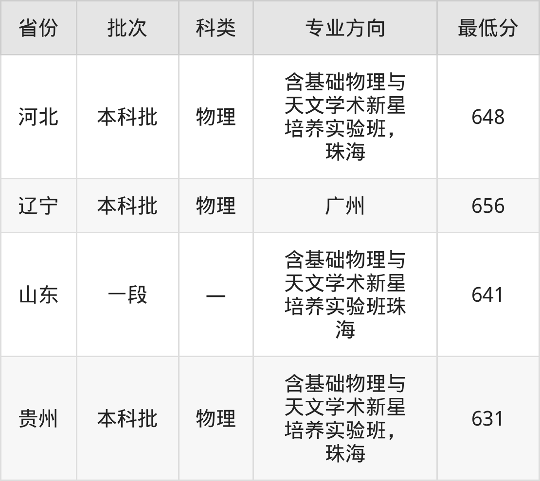 中山大学物理学类专业录取分数线从631分到656分不等,最低分数线如下: