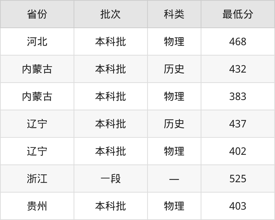 沈阳工学院物流管理专业在全国各省最低录取分数线为383分(内蒙古物理类),除此之外,在其余地区的最低分为辽宁物理类402分、浙江525分、贵州物理类403分、河北物理类468分,以上数据均为2025年数据,供2026年高考生参考。