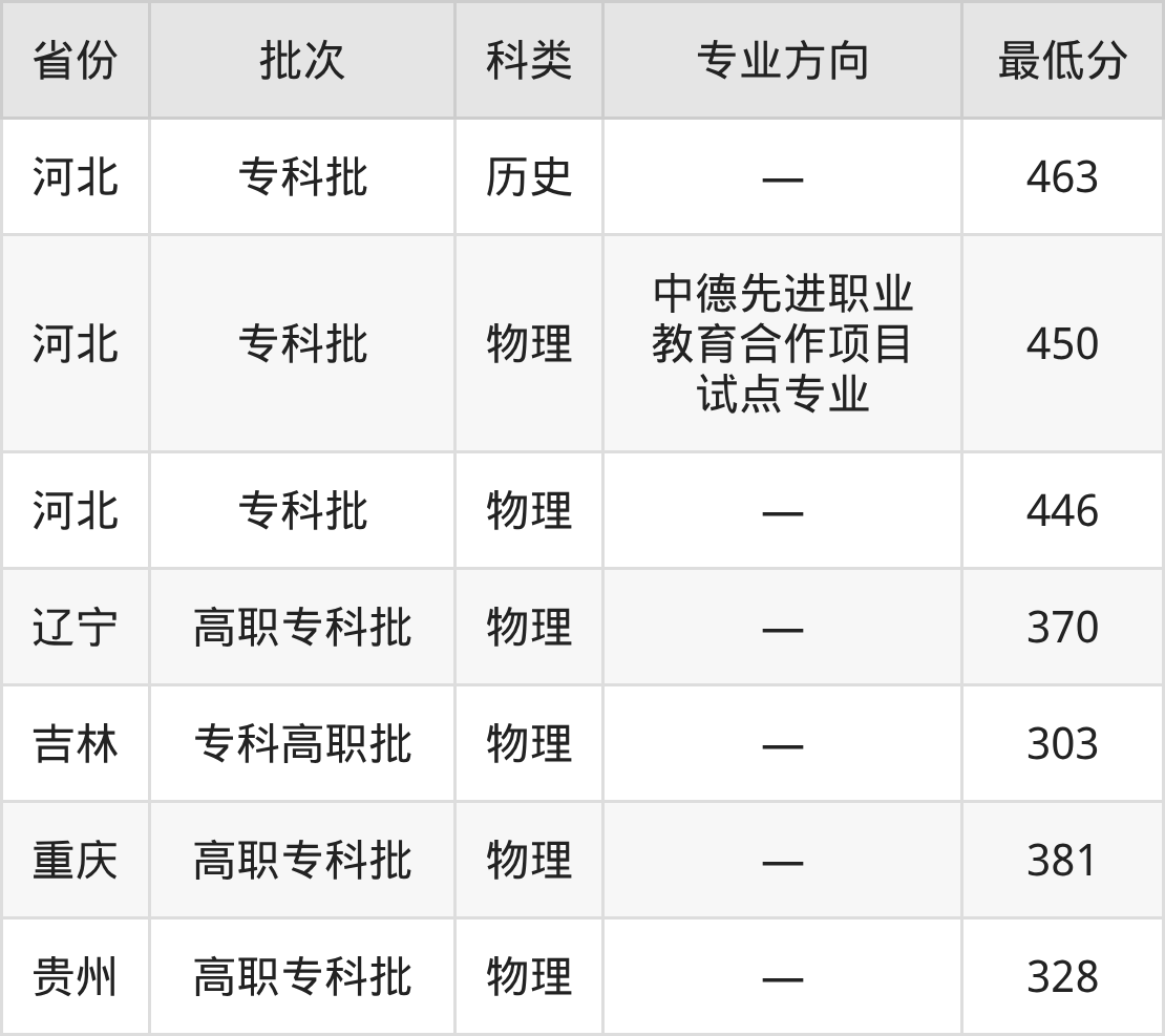 河北机电职业技术学院机械制造及自动化专业录取分数线从303分到463分不等,最低分数线如下: