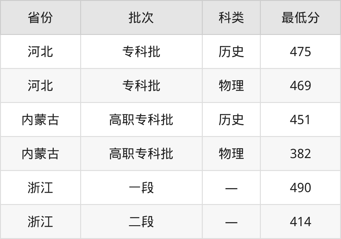 湖北财税职业学院大数据与会计专业在全国各省最低录取分数线为382分(内蒙古物理类),除此之外,在其余地区的最低分为河北物理类469分、浙江414分,以上数据均为2025年数据,供2026年高考生参考。