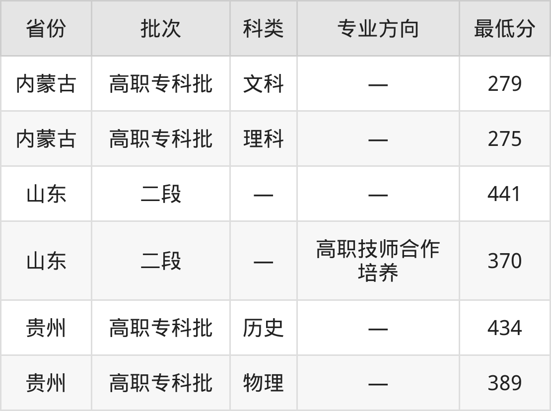淄博职业技术大学数控技术专业录取分数线从275分到441分不等,最低分数线如下: