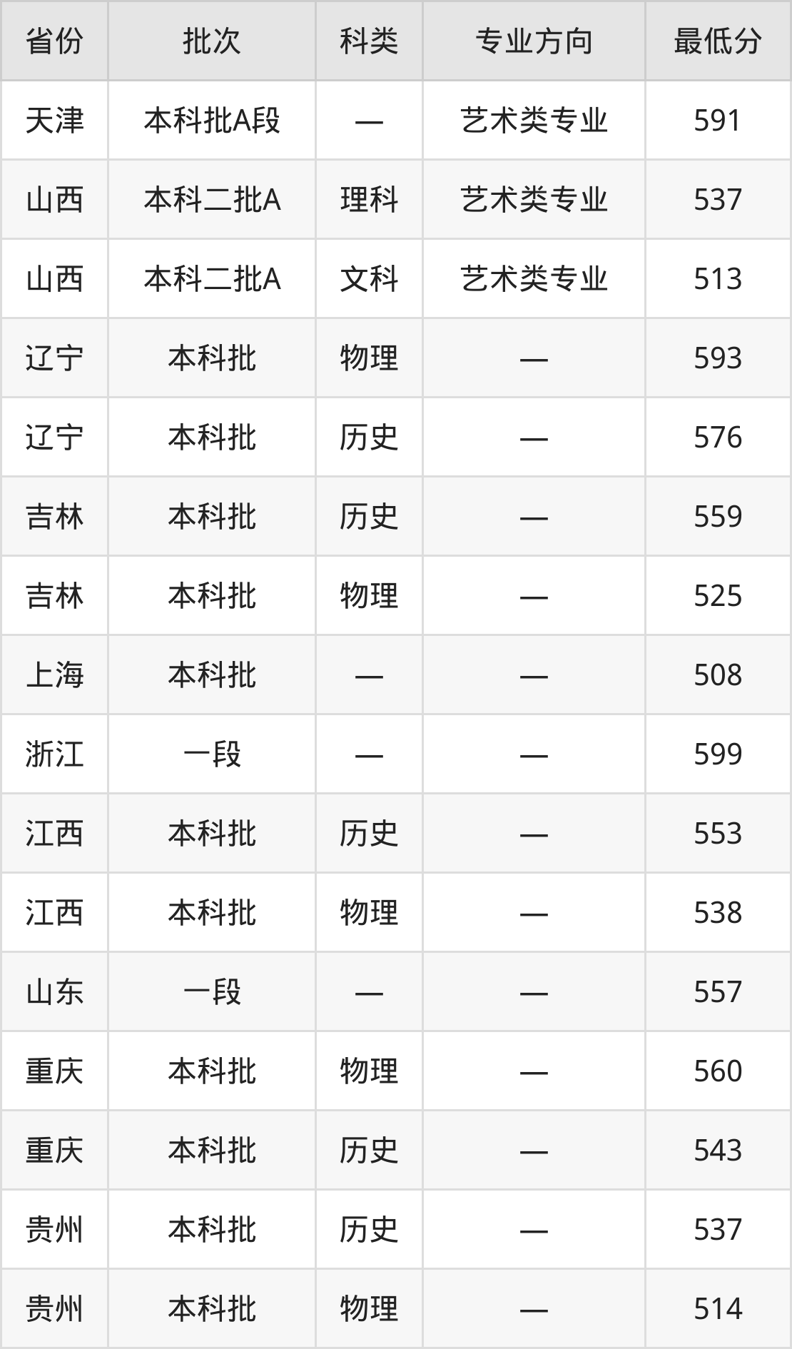 浙江传媒学院广播电视编导专业在全国各省最低录取分数线为508分(上海),除此之外,在其余地区的最低分为天津591分、吉林物理类525分、山东557分、重庆历史类543分等,以上数据均为2024年数据,供2025年高考生参考。