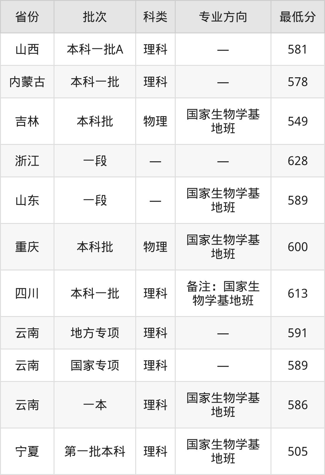 云南大学生物科学专业录取分数线从505分到628分不等,最低分数线如下: