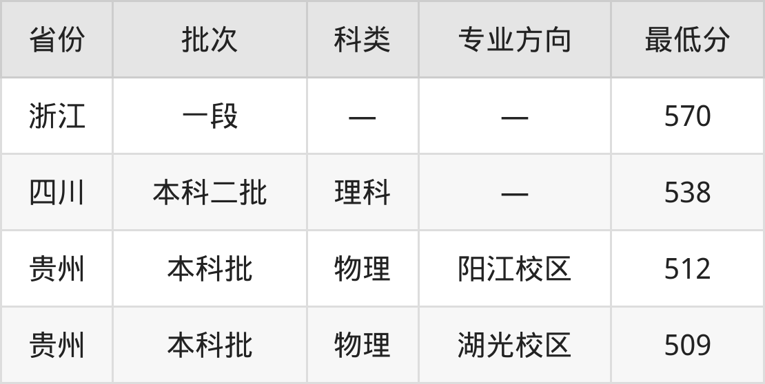 广东海洋大学机械设计制造及其自动化专业在全国各省最低录取分数线为509分(贵州物理类),除此之外,在其余地区的最低分为浙江570分、四川理科538分,以上数据均为2024年数据,供2025年高考生参考。