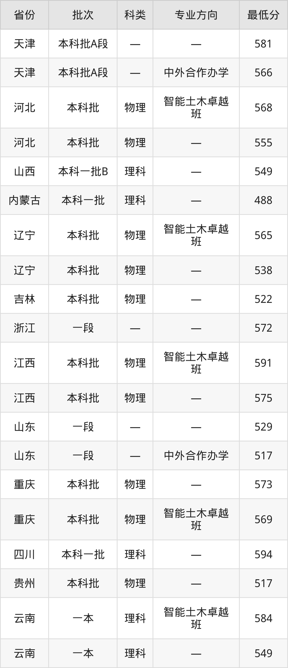 长沙理工大学土木工程专业在全国各省录取分数线: