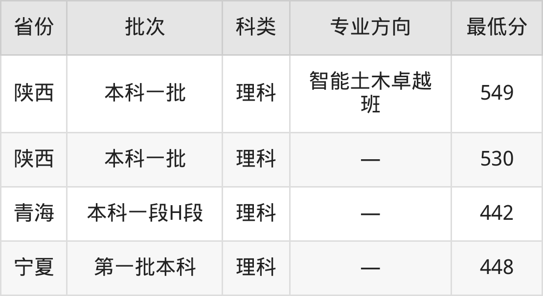 长沙理工大学土木工程专业录取分数线从442分到594分不等,在部分地区的最低分数线如下: