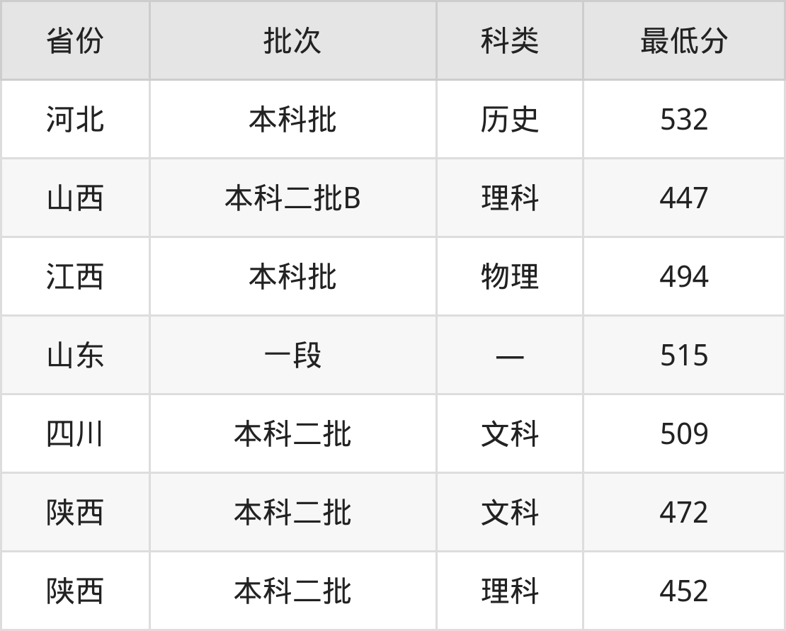 安康学院会计学专业在全国各省最低录取分数线为447分(山西理科),除此之外,在其余地区的最低分为江西物理类494分、山东515分、四川文科509分、陕西理科452分等,以上数据均为2024年数据,供2025年高考生参考。