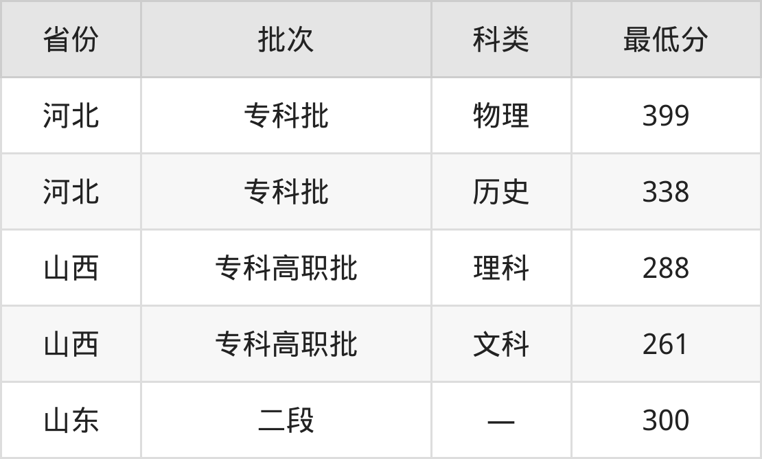 山东外事职业大学护理专业在全国各省最低录取分数线为261分(山西文科),除此之外,在其余地区的最低分为河北历史类338分、山东300分,以上数据均为2024年数据,供2025年高考生参考。