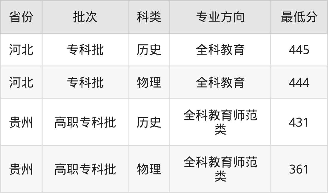 河北正定师范高等专科学校小学教育专业在全国各省最低录取分数线为361分(贵州物理类),除此之外,在其余地区的最低分为河北物理类444分,以上数据均为2025年数据,供2026年高考生参考。