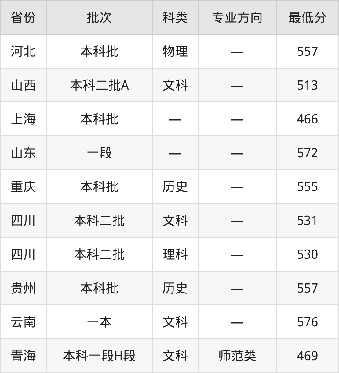 广西师范大学法学专业在全国各省最低录取分数线为466分(上海),除此之外,在其余地区的最低分为重庆历史类555分、贵州历史类557分、云南文科576分、青海文科469分等,以上数据均为2024年数据,供2025年高考生参考。