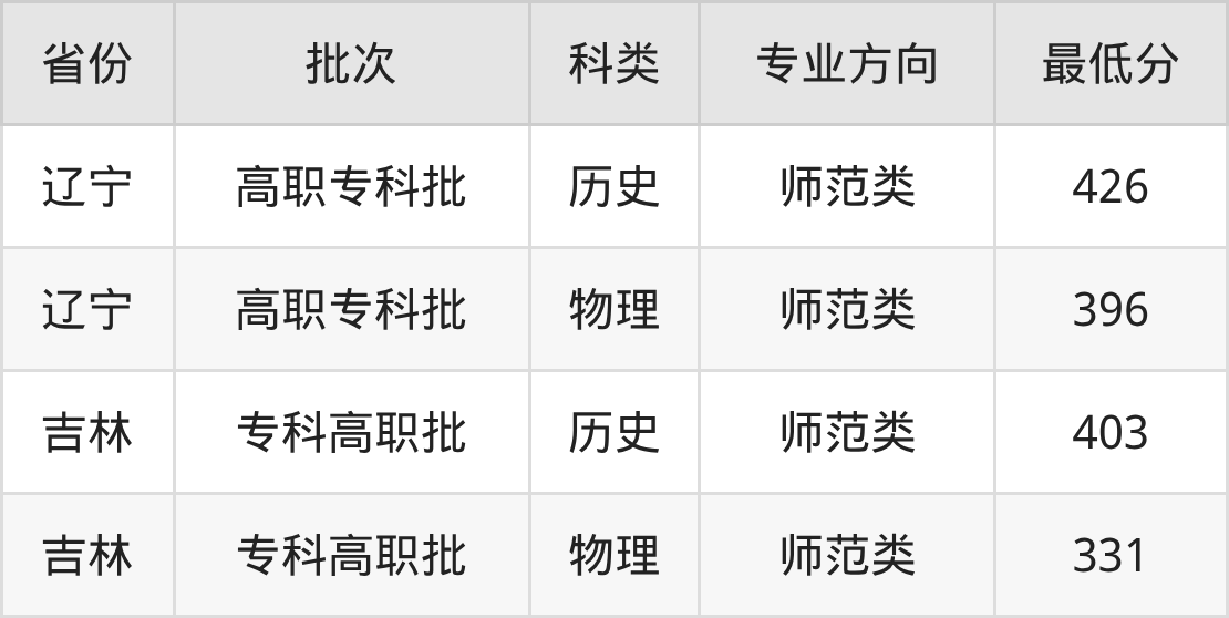 辽宁民族师范高等专科学校小学教育专业录取分数线从331分到426分不等,最低分数线如下: