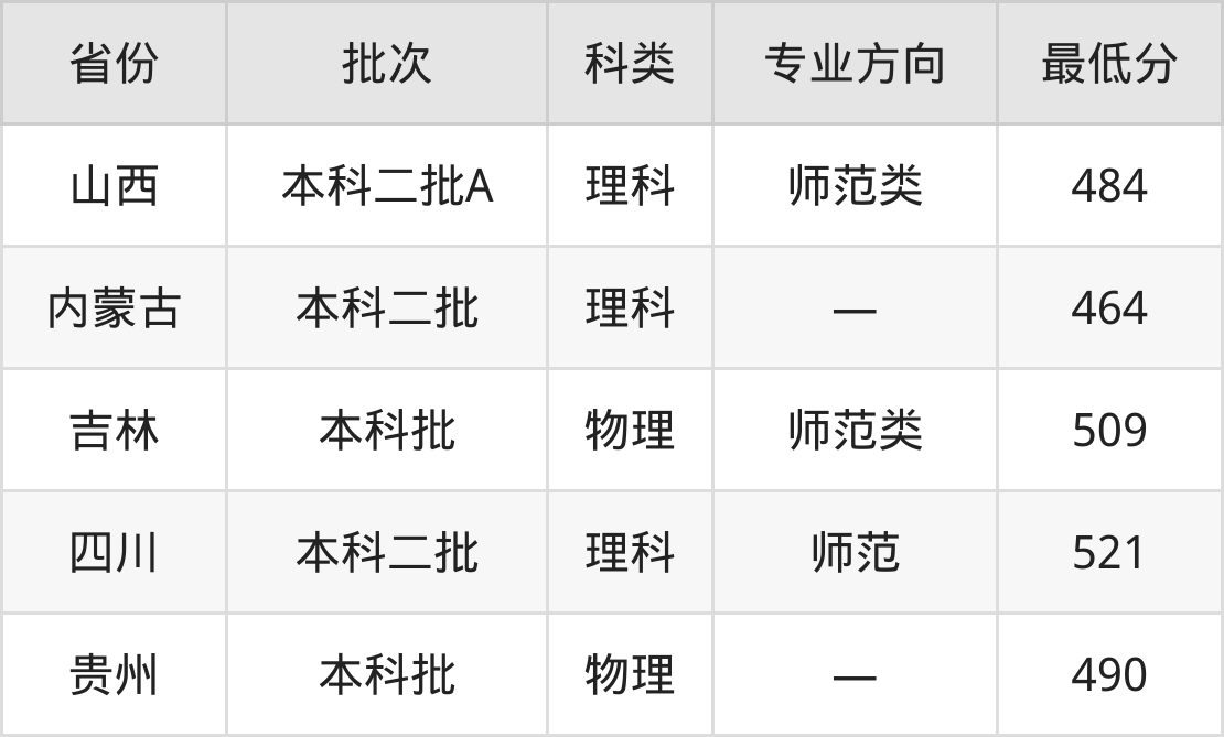 北华大学生物科学专业在全国各省最低录取分数线为464分(内蒙古理科),除此之外,在其余地区的最低分为山西理科484分、吉林物理类509分、四川理科521分、贵州物理类490分,以上数据均为2024年数据,供2025年高考生参考。