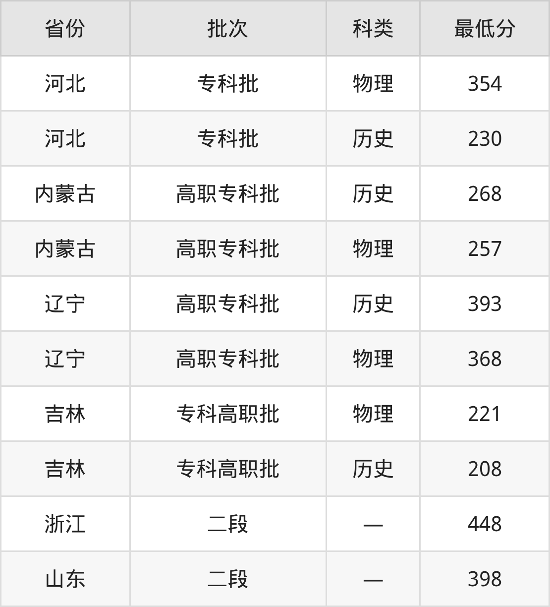 吉林职业技术学院中医学专业在全国各省最低录取分数线为208分(吉林历史类),除此之外,在其余地区的最低分为浙江448分、山东398分、河北历史类230分、内蒙古物理类257分等,以上数据均为2025年数据,供2026年高考生参考。
