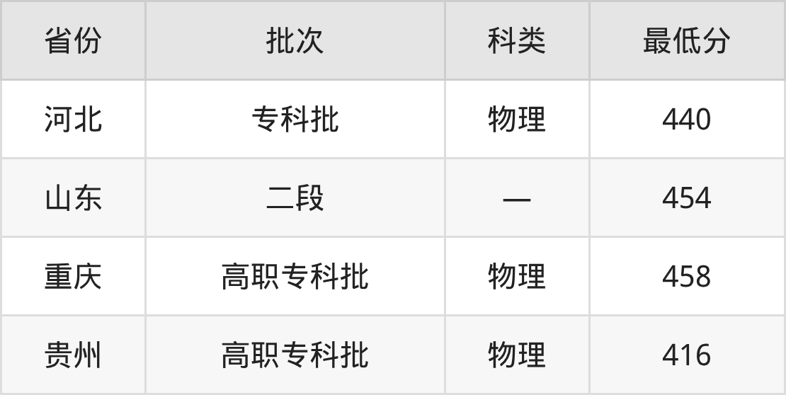 遵义医药高等专科学校临床医学专业在全国各省最低录取分数线为416分(贵州物理类),除此之外,在其余地区的最低分为河北物理类440分、山东454分、重庆物理类458分,以上数据均为2025年数据,供2026年高考生参考。