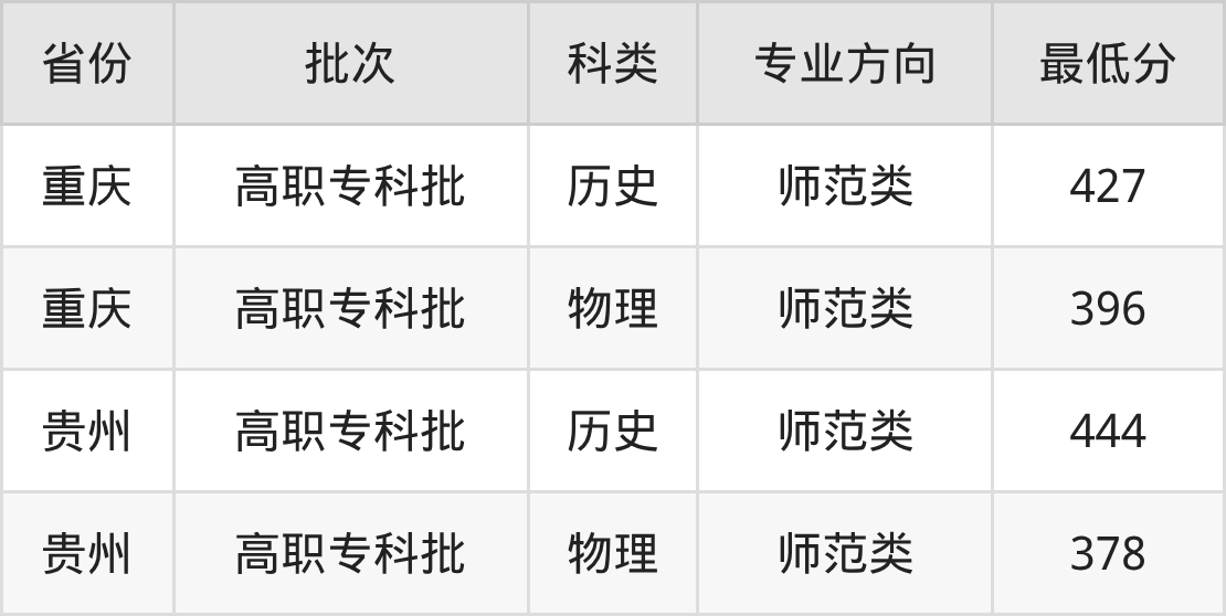 贵阳幼儿师范高等专科学校特殊教育专业录取分数线从378分到444分不等,最低分数线如下: