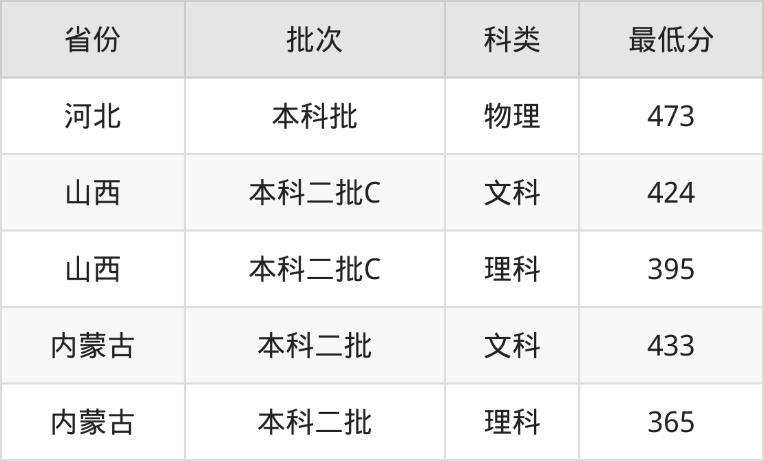 山西工商学院烹饪与营养教育专业录取分数线从365分到473分不等,最低分数线如下: