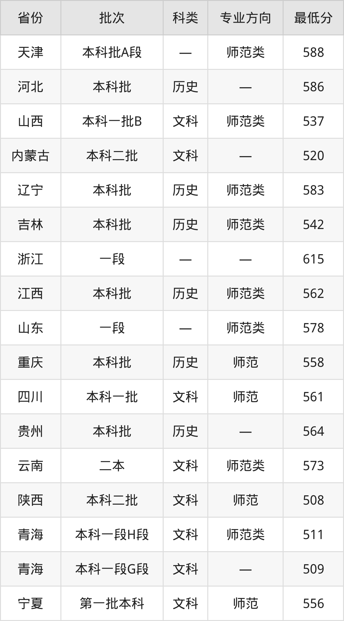 西北师范大学汉语言文学专业录取分数线从508分到615分不等,在部分地区的最低分数线如下: