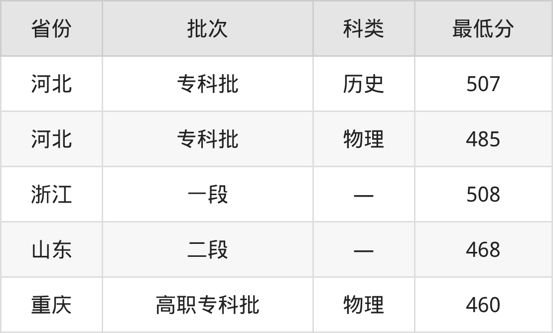 浙江经济职业技术学院大数据技术专业在全国各省最低录取分数线为460分(重庆物理类),除此之外,在其余地区的最低分为河北物理类485分、浙江508分、山东468分,以上数据均为2025年数据,供2026年高考生参考。