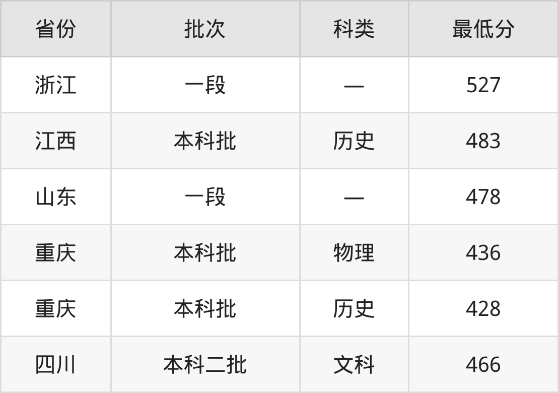 湖南涉外经济学院日语专业在全国各省最低录取分数线为428分(重庆历史类),除此之外,在其余地区的最低分为四川文科466分、浙江527分、江西历史类483分、山东478分等,以上数据均为2024年数据,供2025年高考生参考。