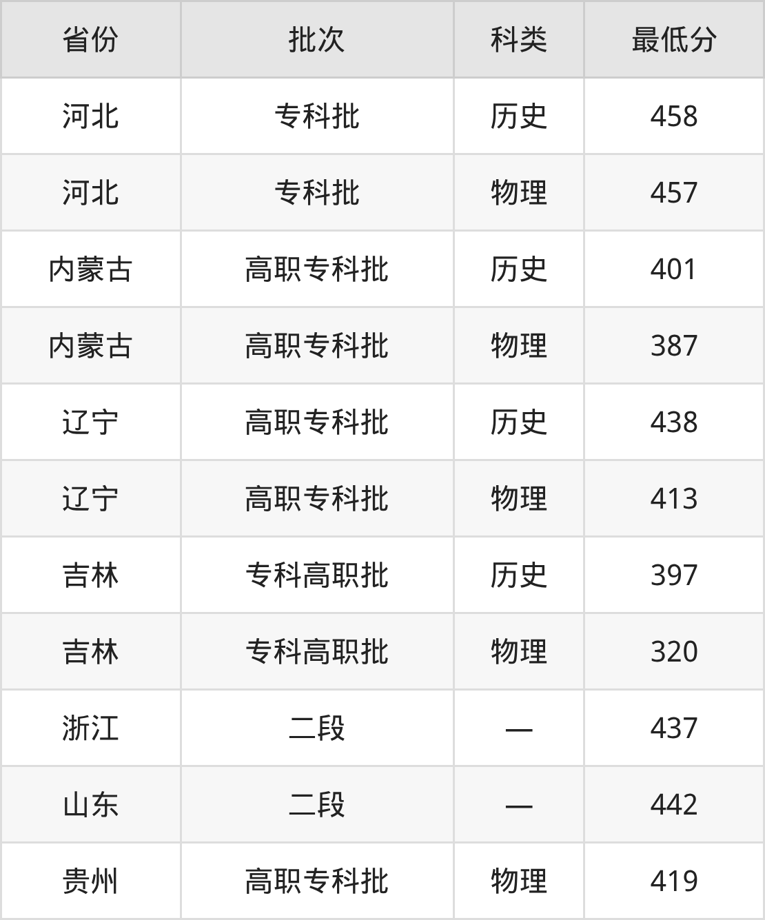 黑龙江职业学院电气自动化技术专业录取分数线从320分到458分不等,最低分数线如下: