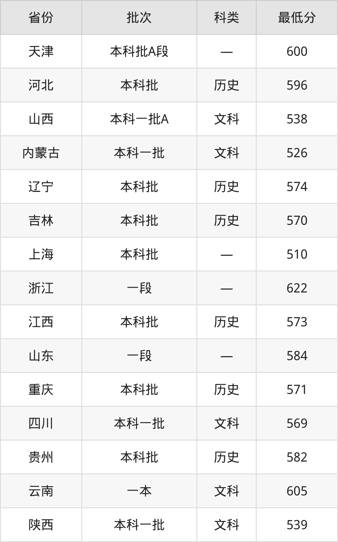 山西大学历史学专业录取分数线从510分到622分不等,在部分地区的最低分数线如下: