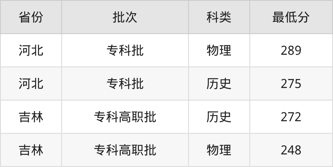 吉林城市职业技术学院汽车制造与试验技术专业录取分数线从248分到289分不等,最低分数线如下: