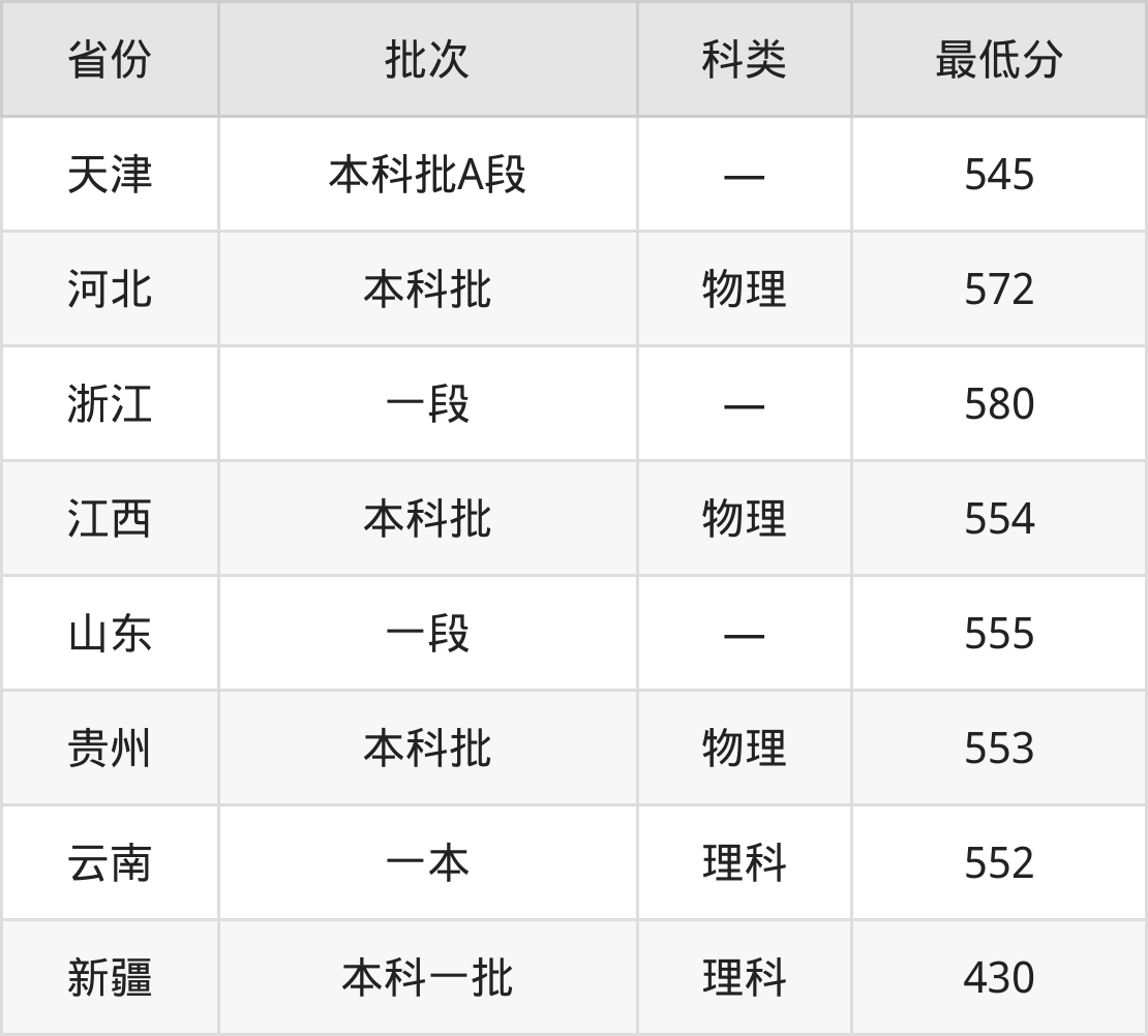 江西理工大学电子信息工程专业在全国各省最低录取分数线为430分(新疆理科),除此之外,在其余地区的最低分为山东555分、贵州物理类553分、云南理科552分、天津545分等,以上数据均为2024年数据,供2025年高考生参考。