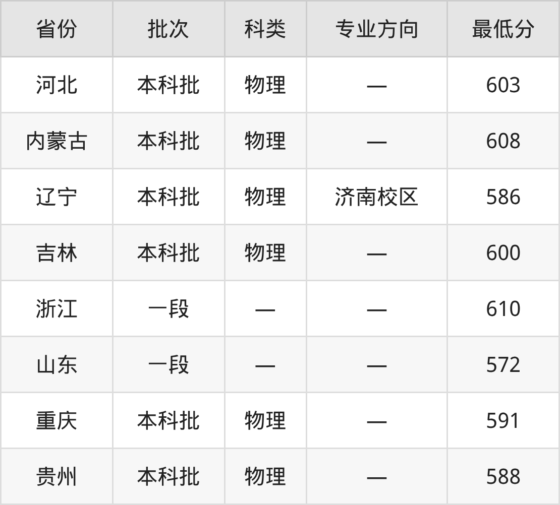 山东第一医科大学临床医学专业在全国各省最低录取分数线为572分(山东),除此之外,在其余地区的最低分为重庆物理类591分、贵州物理类588分、河北物理类603分、内蒙古物理类608分等,以上数据均为2025年数据,供2026年高考生参考。