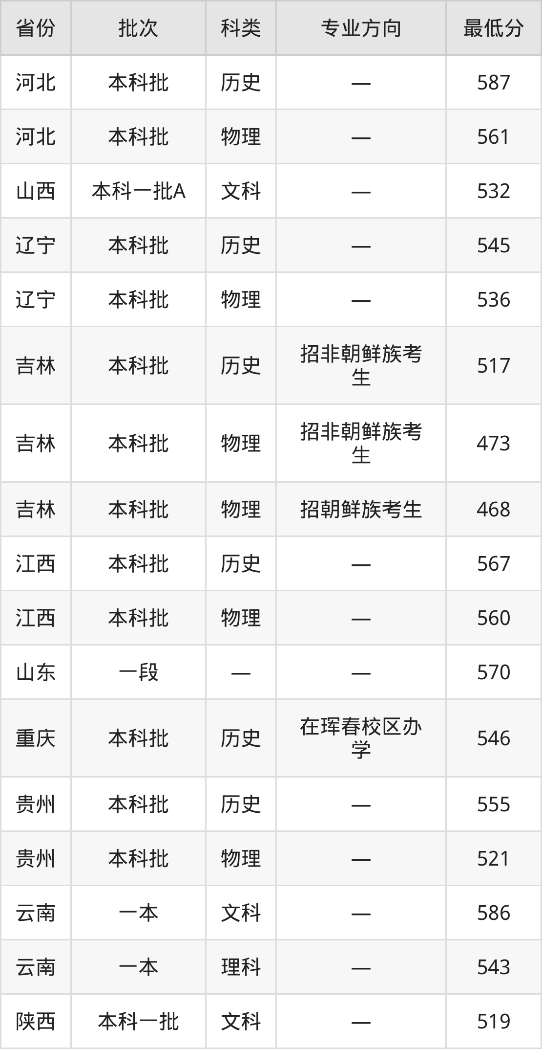 延边大学旅游管理专业录取分数线从468分到587分不等,最低分数线如下:
