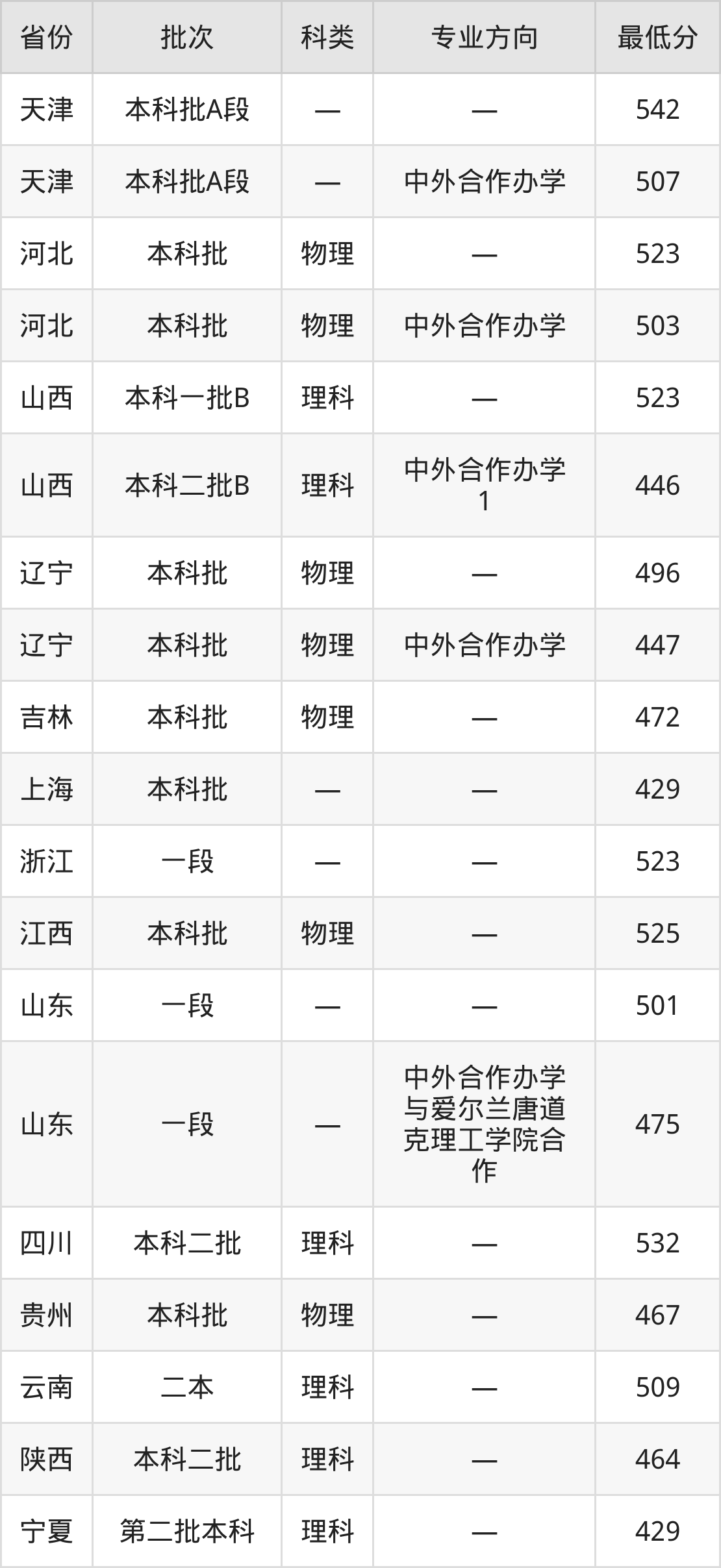 河北工程大学土木工程专业录取分数线从429分到542分不等,在部分地区的最低分数线如下: