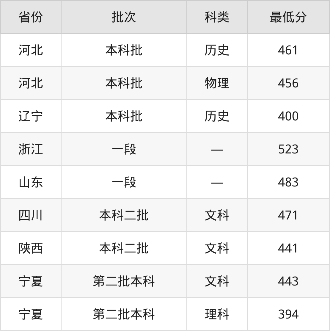 宁夏理工学院日语专业在全国各省最低录取分数线为394分(宁夏理科),除此之外,在其余地区的最低分为河北物理类456分、辽宁历史类400分、浙江523分、山东483分等,以上数据均为2024年数据,供2025年高考生参考。