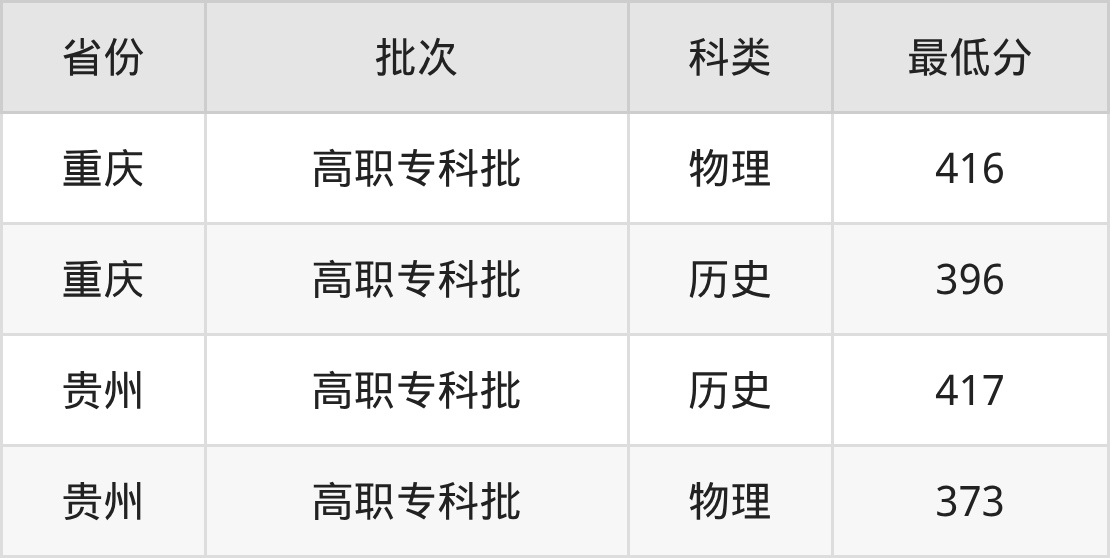 郴州职业技术学院机电一体化技术专业录取分数线从373分到417分不等,最低分数线如下: