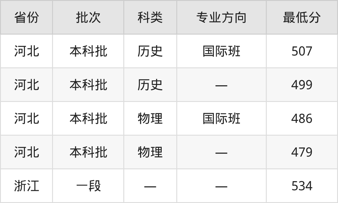 温州商学院国际经济与贸易专业在全国各省最低录取分数线为479分(河北物理类),除此之外,在其余地区的最低分为浙江534分,以上数据均为2025年数据,供2026年高考生参考。