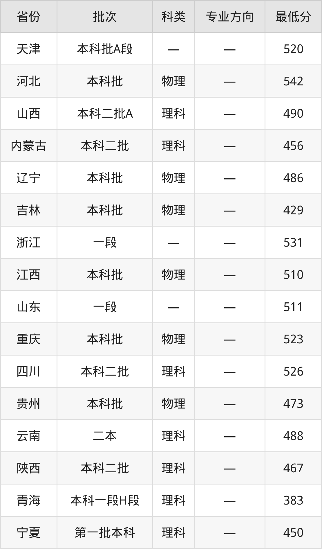 西北民族大学电子信息类专业录取分数线从383分到542分不等,在部分地区的最低分数线如下: