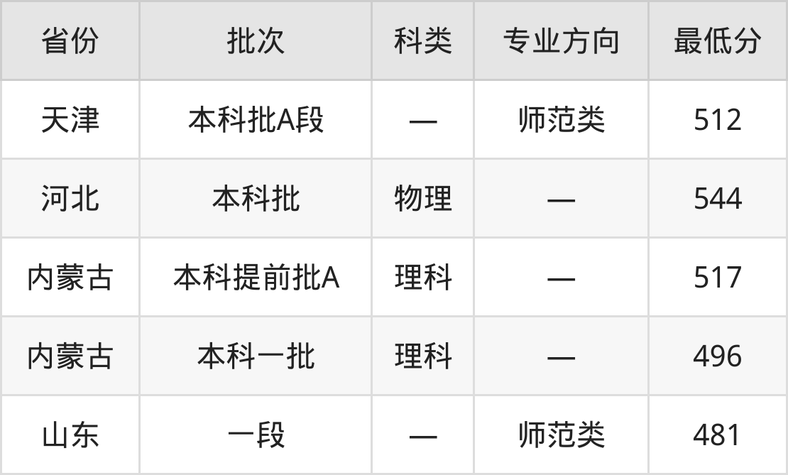 内蒙古师范大学物理学专业在全国各省录取分数线: