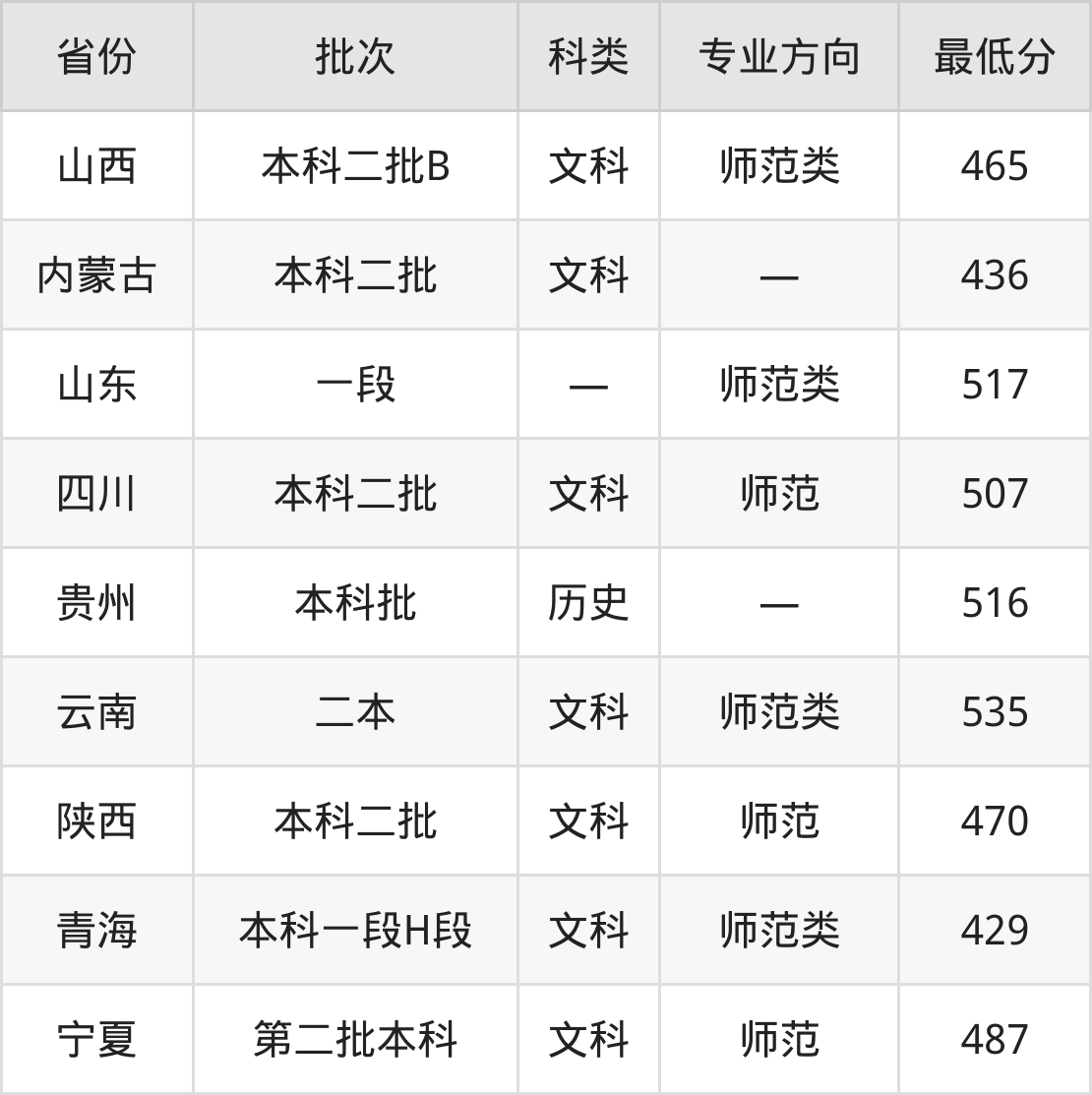 甘肃民族师范学院汉语言文学专业在全国各省录取分数线: