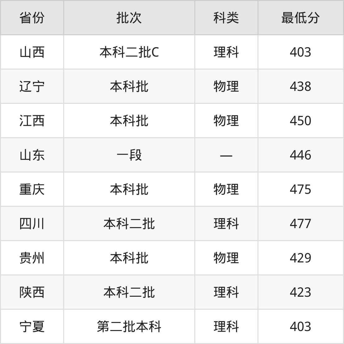 南昌交通学院铁道工程专业在全国各省最低录取分数线为403分(山西理科),除此之外,在其余地区的最低分为辽宁物理类438分、江西物理类450分、山东446分、重庆物理类475分等,以上数据均为2024年数据,供2025年高考生参考。