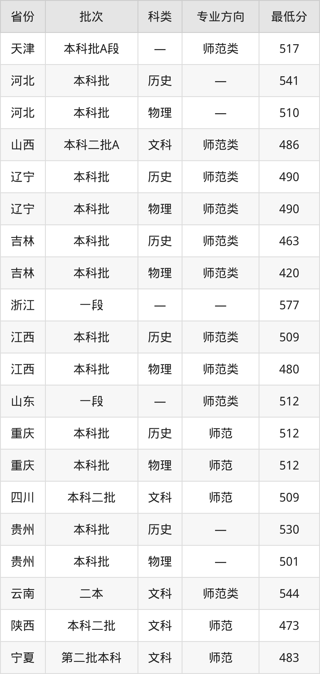 喀什大学汉语言文学专业录取分数线从420分到577分不等,在部分地区的最低分数线如下: