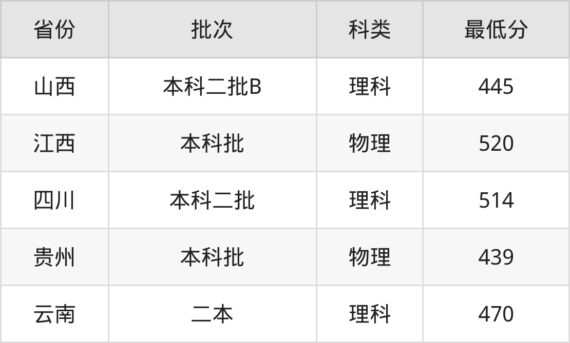 福建江夏学院土木工程专业在全国各省最低录取分数线为439分(贵州物理类),除此之外,在其余地区的最低分为云南理科470分、山西理科445分、江西物理类520分、四川理科514分,以上数据均为2024年数据,供2025年高考生参考。