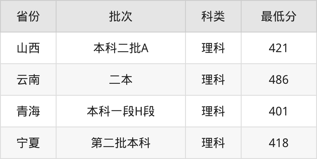 湖南理工学院知识产权专业在全国各省最低录取分数线为401分(青海理科),除此之外,在其余地区的最低分为山西理科421分、云南理科486分、宁夏理科418分,以上数据均为2024年数据,供2025年高考生参考。