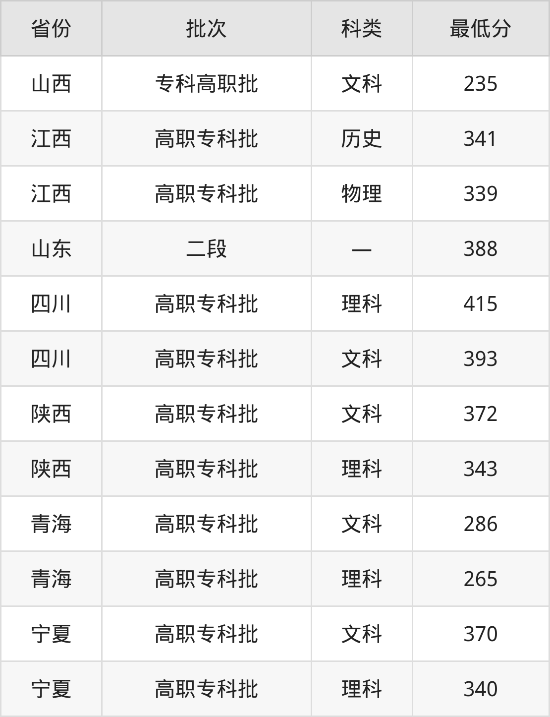 甘肃林业职业技术大学环境监测技术专业录取分数线从235分到415分不等,最低分数线如下: