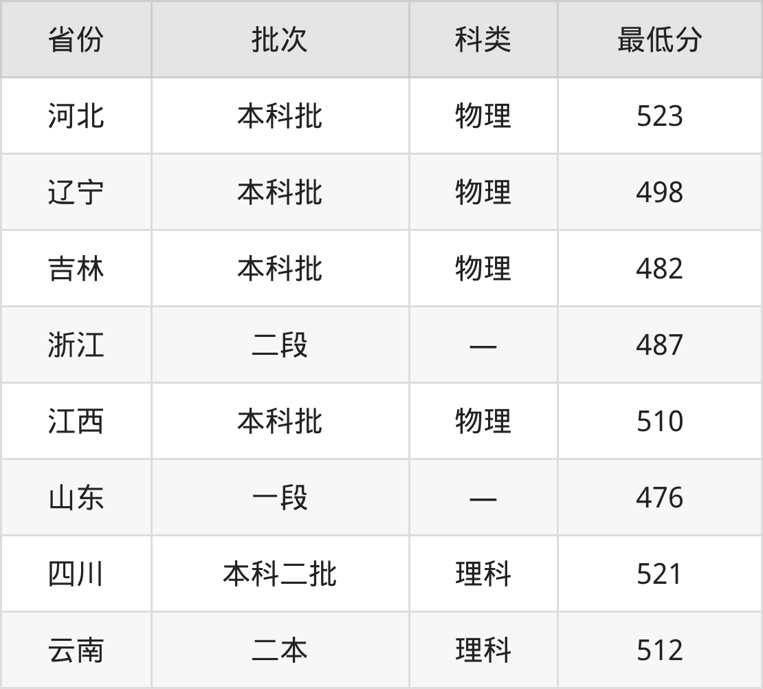 济宁医学院药物制剂专业在全国各省最低录取分数线为476分(山东),除此之外,在其余地区的最低分为江西物理类510分、四川理科521分、云南理科512分、河北物理类523分等,以上数据均为2024年数据,供2025年高考生参考。